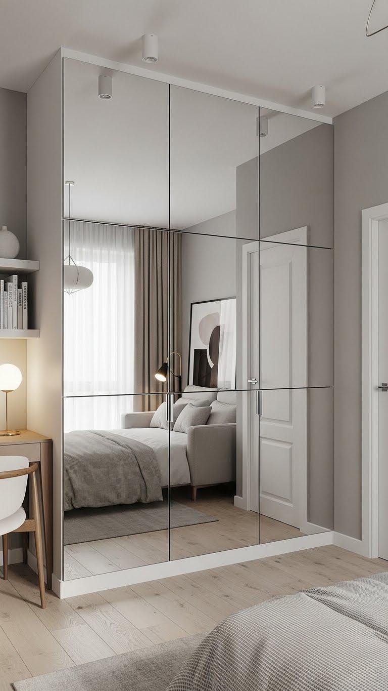 Often overlooked, a full mirror panel wall transforms a room by multiplying light and visually expanding the space—perfect for small apartments, hallways, or studios.