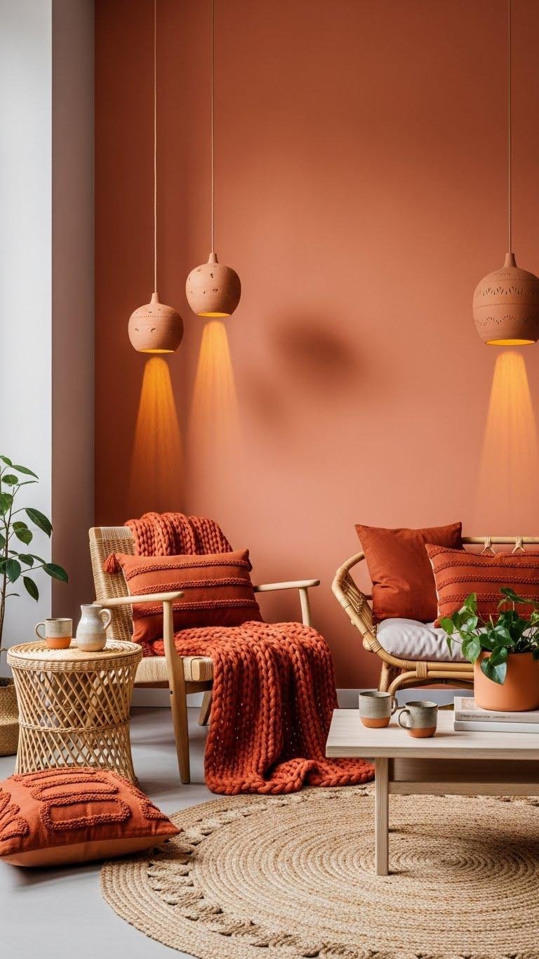 Bring terracotta into a single wall to bathe the room in earthy warmth and instant coziness. You’ll pair textured terracotta textiles and matte paint to add depth while keeping lines clean.