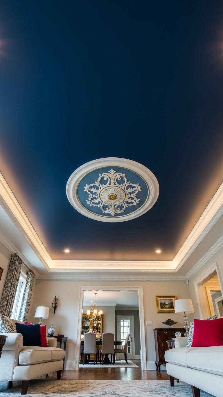 You’ll create a high contrast ceiling that enlarges proportions and adds drama. Pair it with crisp floating crown molding to frame the effect.