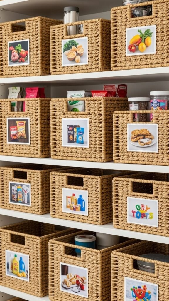 Often you’ll find matching picture labels make it instant and intuitive to grab the right basket — just stick a photo of the contents on the front so everyone knows what’s inside at a glance.