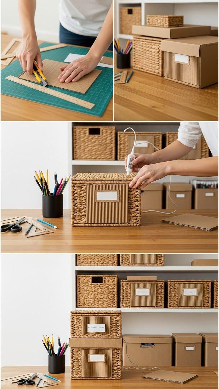 If you want a quick, low-cost way to hide what’s inside your baskets, cut and attach cardboard fronts to give them a clean, uniform look. You’ll add a hidden label for quick ID and slip on temporary lids when needed. Cut to size, secure with tape or Velcro, and paint or cover for a tidy, liberated space that’s easy to change.