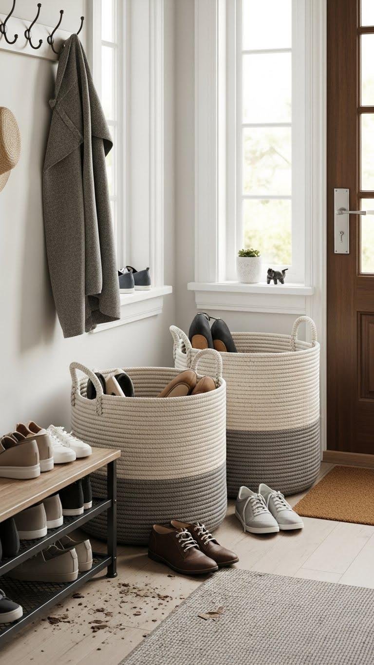 Tuck large floor baskets by the door to keep shoes contained and ready — grab-and-go access cuts mud and clutter at the threshold.