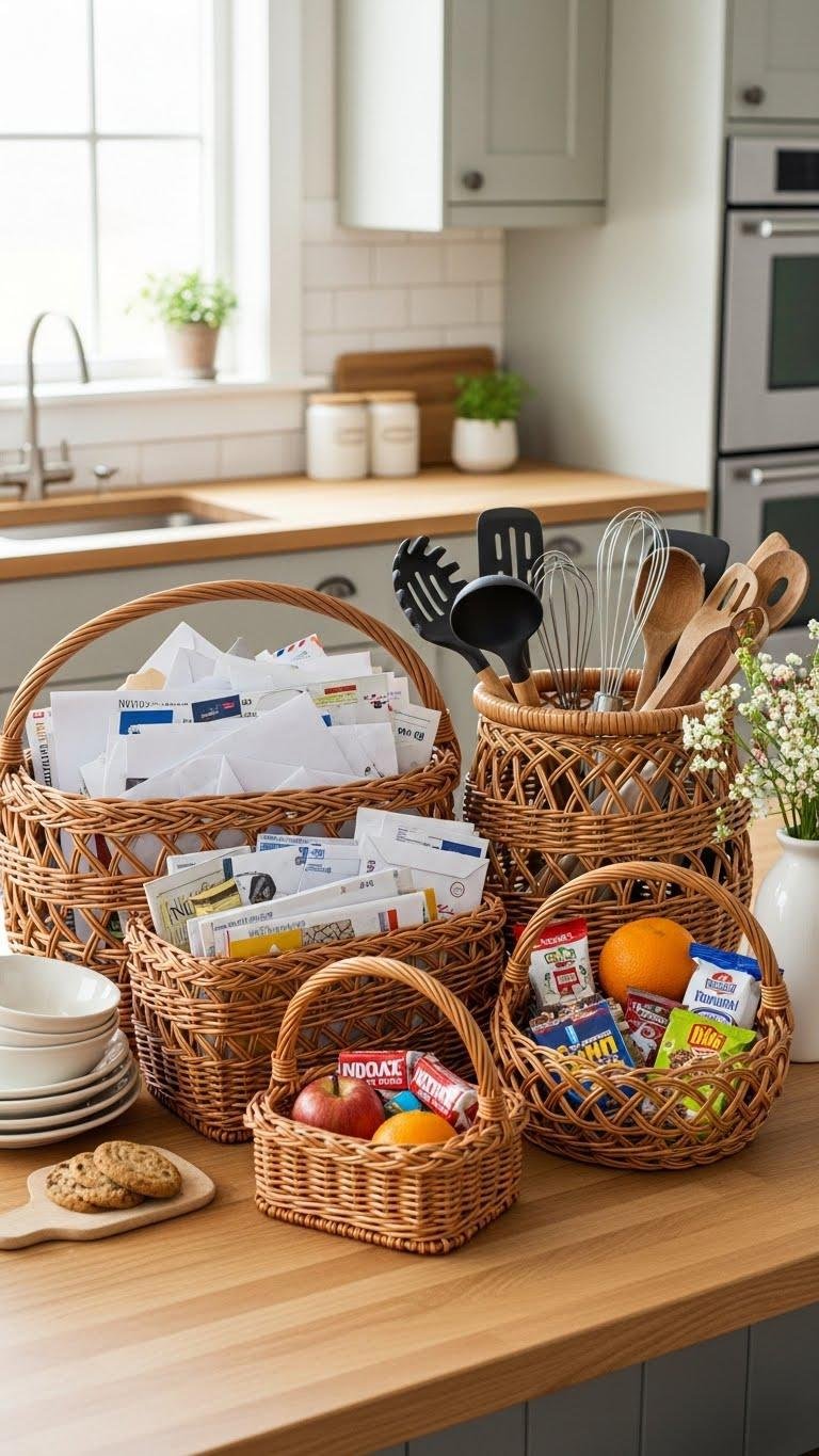Choose sizes that corral mail, utensils, and snacks; grab woven handles to move baskets when you need space.