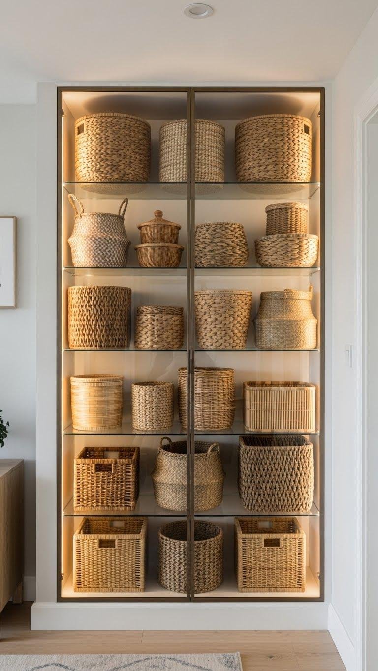 You’ll use glass fronted styling to protect contents, arrange baskets by function, and create a soft lit display with interior lighting that highlights organization without feeling cluttered.