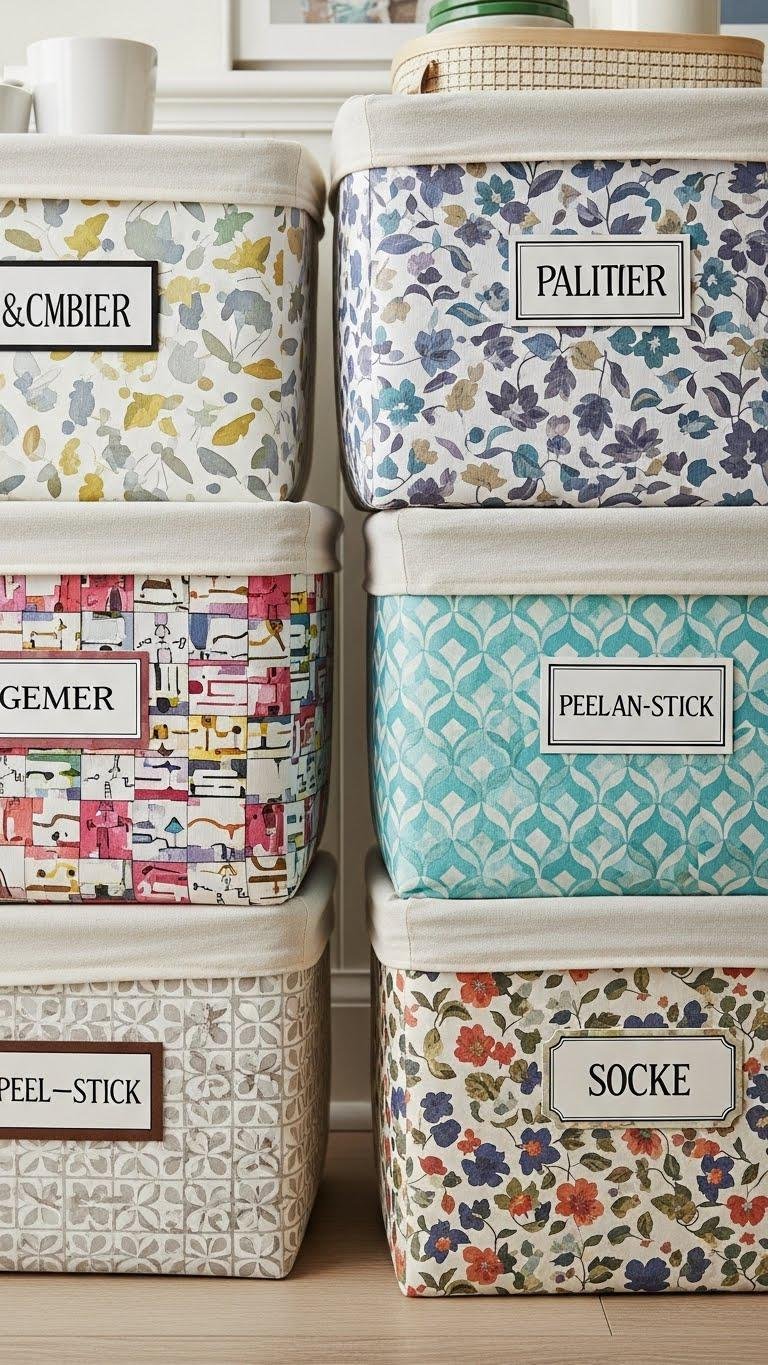 You can cut patterned adhesive to fit, press textured vinyl for durability, and write or stencil contents. It’s removable, lets you change looks fast, and keeps baskets uniform so clutter feels contained, not controlling.