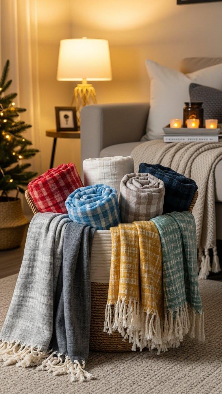 Frequently keep your go-to throws in a large floor basket so they’re easy to grab for movie nights, naps, or chilly evenings. Place the basket near seating for cozy access, folding throws loosely so they look relaxed.