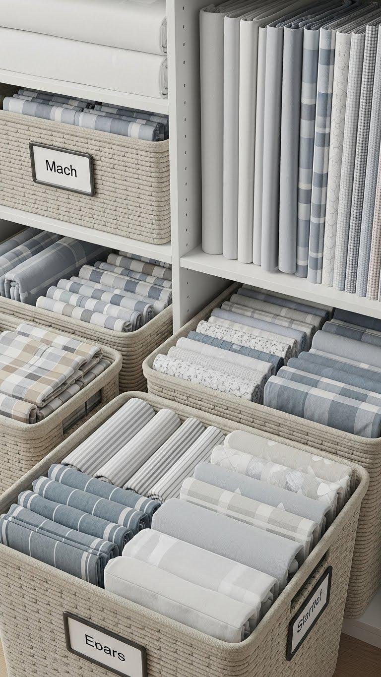 Stack folded sheets vertically for visibility, slide baskets forward on shelves for quick access, and reclaim time and space so you can focus on living, not searching.