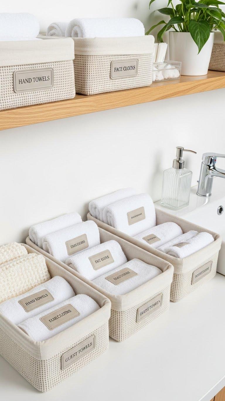 If you want small towels and washcloths to stay neat and easy to grab, use shallow baskets that fit on open shelves or inside cabinets.