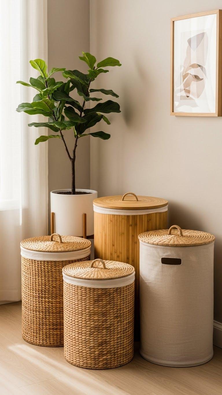 When you want a laundry solution that hides clutter and complements your decor, choose tall lidded baskets as stylish hampers; they stand upright in corners or closets, keep odors contained, and make sorting easy.