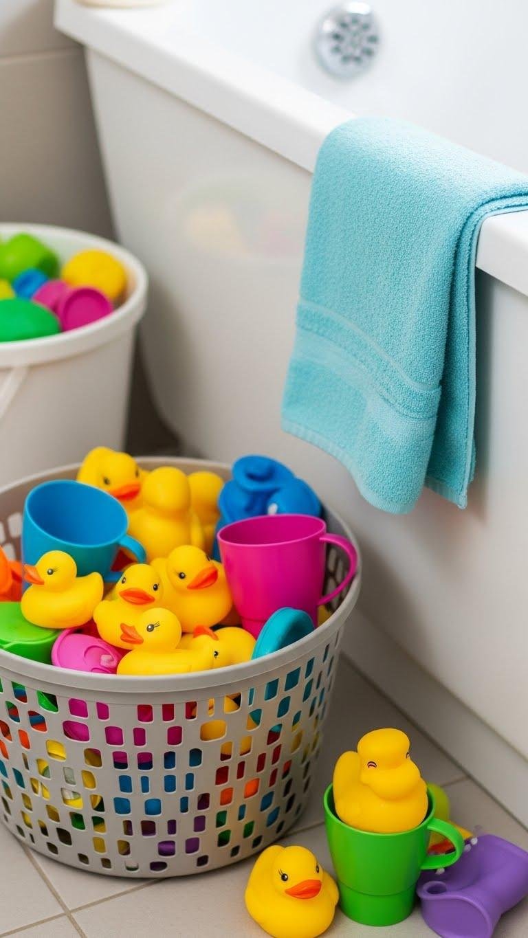 You’ll grab a roomy bath toy basket or a sleek waterproof organizer, toss in rubber ducks and cups, then hang or stash it within reach. Kids learn to drop toys in; you reclaim time and a clutter-free space.