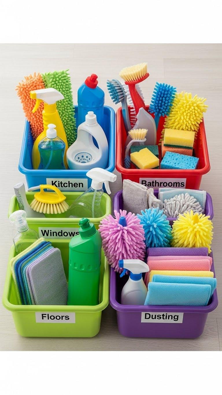 Corral your cleaning supplies into labeled plastic tubs so grabbing the right product takes seconds instead of a scavenger hunt. You’ll use caddy sorting to separate sprays, cloths, and specialty cleaners by room.