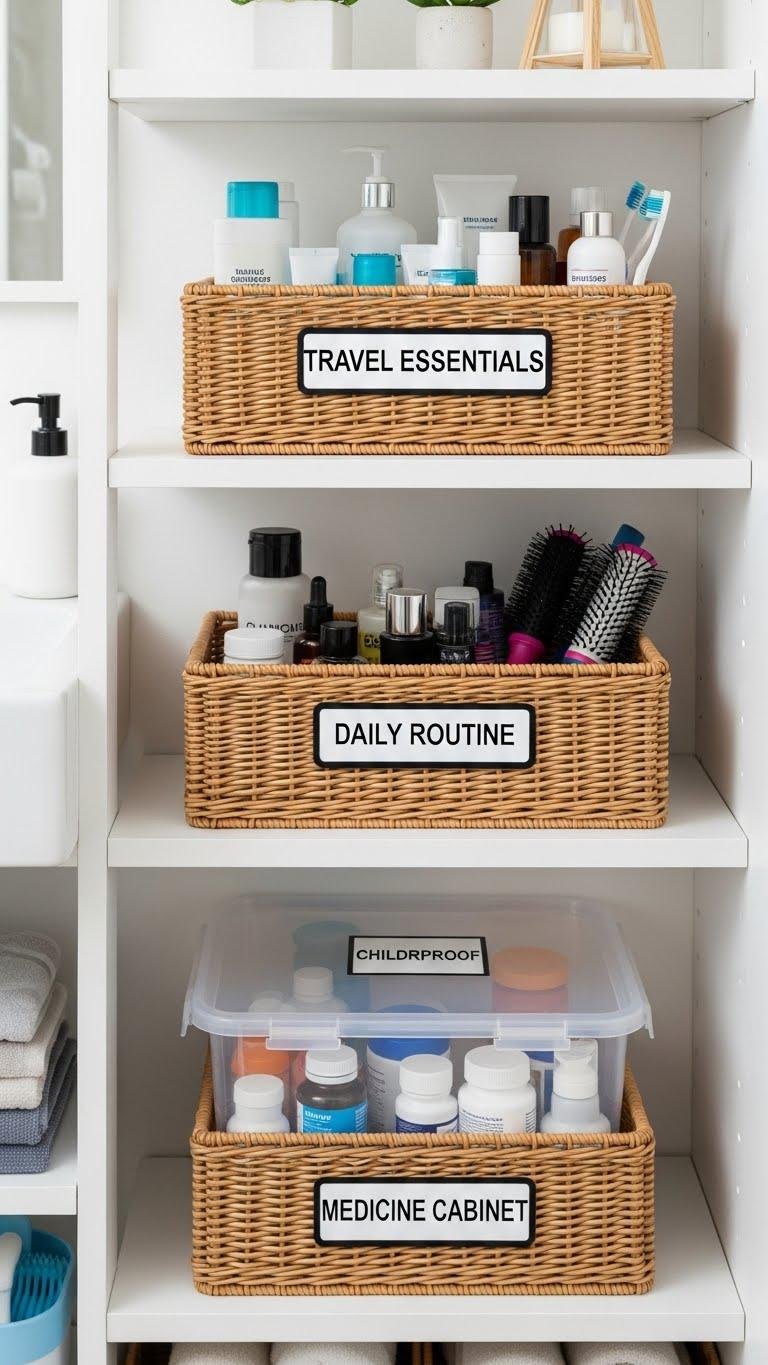 Keep travel sized toiletries in one small basket for grab-and-go freedom, stash daily creams and hair tools in another, and dedicate a clearly labeled bin for medicine sorting with childproof lids.