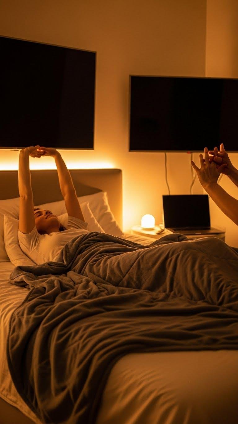 You’ll benefit from soft dimming, warm bulbs, and removing devices; pair this with a tactile wind down — stretching, weighted blanket, or gentle hand massage.