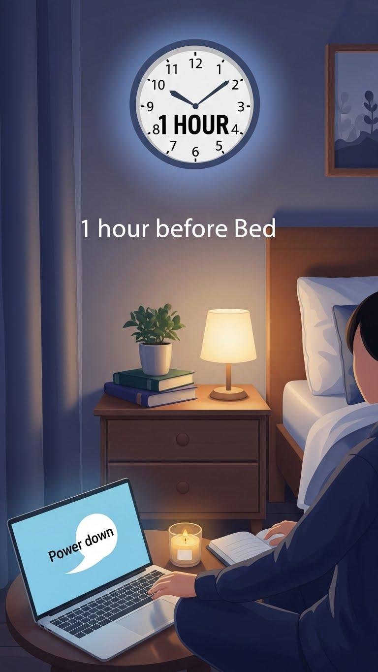 Regularly powering down screens an hour (or at least 30 minutes) before bed helps your brain shift into sleep mode by reducing blue light exposure and mental stimulation.