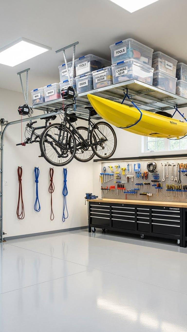 Ceiling-mounted racks and pulley systems free up your floor space and make seasonal gear easy to reach, giving you a cleaner, more efficient garage without a pricey remodel.
