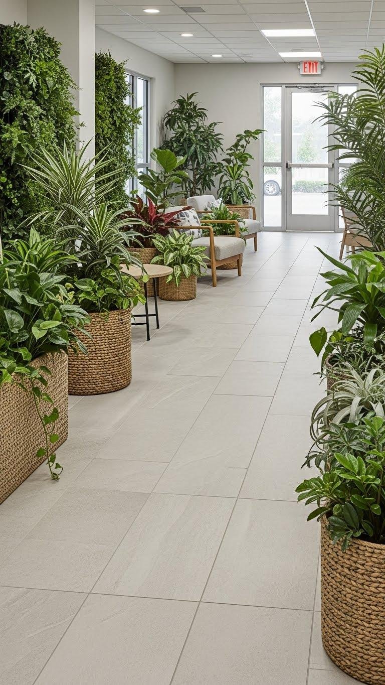 After swapping in durable porcelain tile for busy zones, you can soften those sleek surfaces by adding biophilic elements and indoor plants. Choose low-maintenance air purifying plants, woven planters, and modular vertical greenery to reclaim calm without clutter.