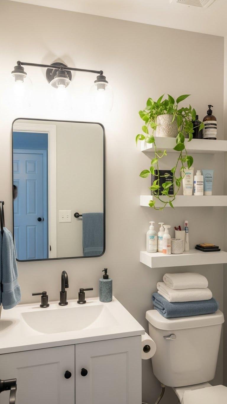 Start by installing a compact pocket vanity for storage without clutter, add minimalist shelving for toiletries, swap fixtures for matte black pieces, upgrade lighting for flattering brightness, and style with a plant and crisp towels to keep the space free and functional.