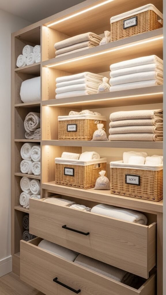 You’ll curate a calm folded towel display, labeled baskets, and vertical cubbies for sheets. Install soft LED strips, add fragrant linen sachets, and keep everything accessible so your daily routine feels liberated and effortless.