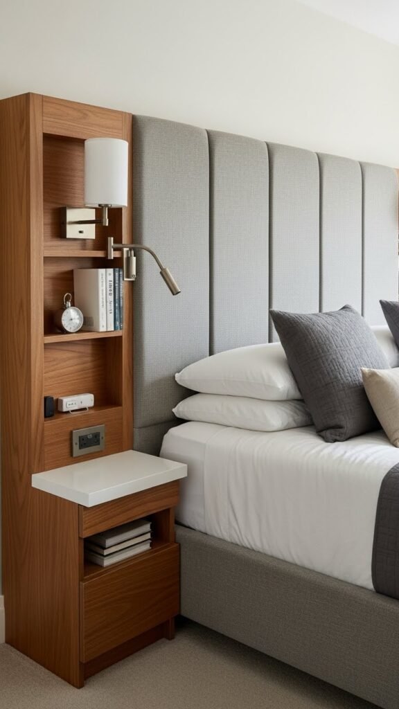 Anchor your bed with an upholstered headboard that hides smart storage and integrated sconces, giving you a hotel-worthy backdrop without sacrificing function.