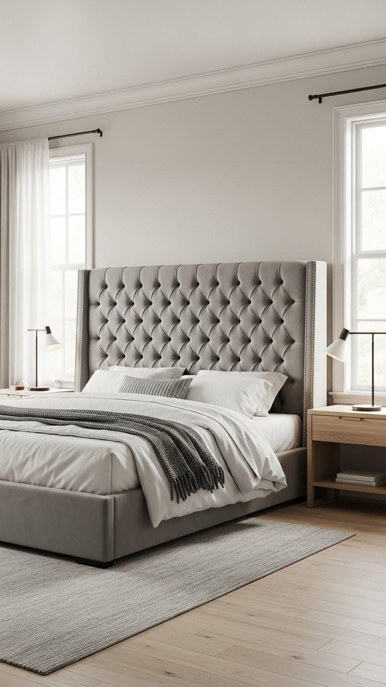 A plush tufted upholstered headboard instantly elevates your bedroom by pairing cozy comfort with tailored sophistication; you’ll get a luxe, hotel-worthy look without hiring a pro.
