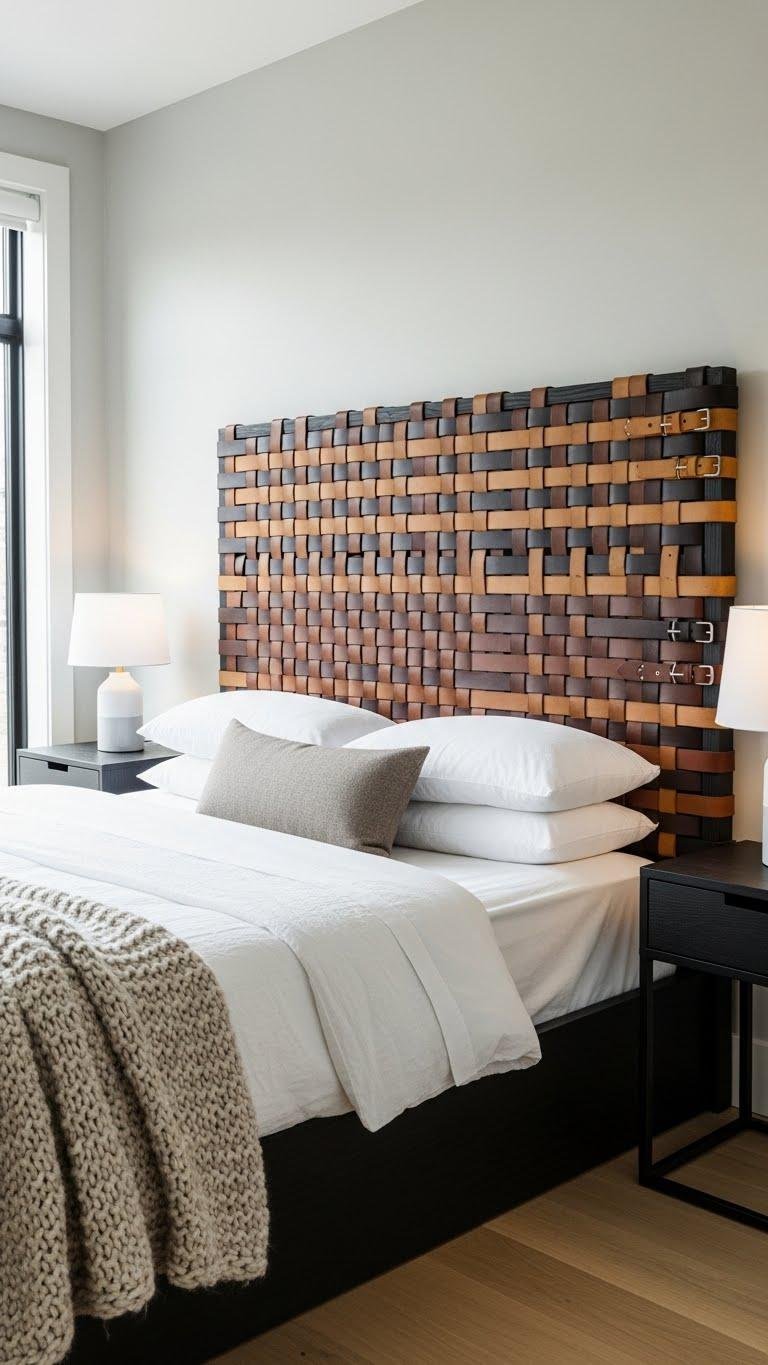 Weaving leather belts into a headboard turns simple materials into a sleek, tactile focal point that feels both modern and warm.