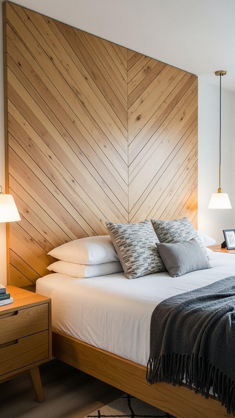 Construct a striking plywood chevron panel headboard by cutting clean, angled planks and arranging them in a bold V pattern that adds instant texture and modern geometry to your bedroom.