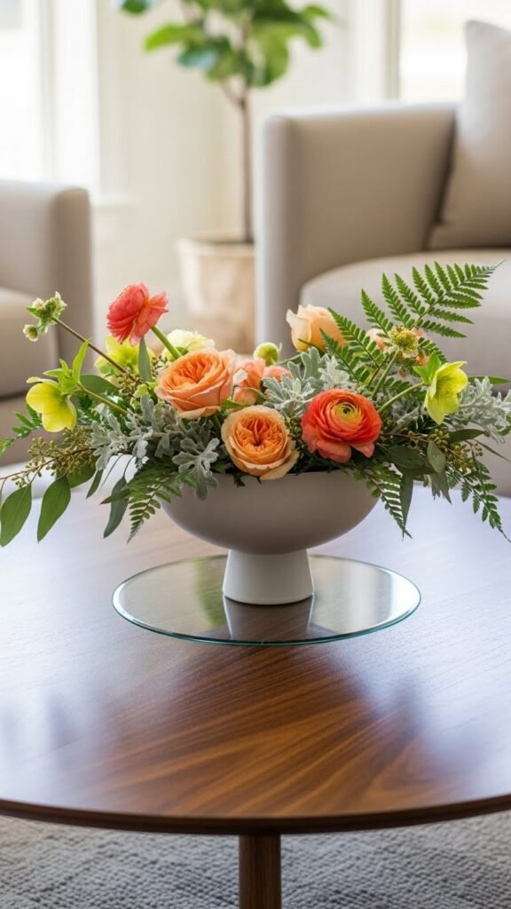 You’ll craft a relaxed, modern low centerpiece by clustering seasonal stems and pedestal greens, letting stems spill naturally. Keep water shallow, trim stems, and rotate blooms for effortless, liberated style.