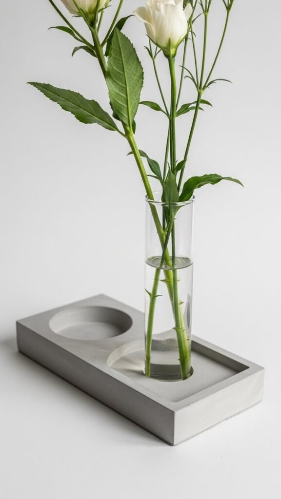 Place a glass tube or small vase in the tray’s recess to hold stems. It’s modern, sturdy, and lets your arrangements breathe freely.