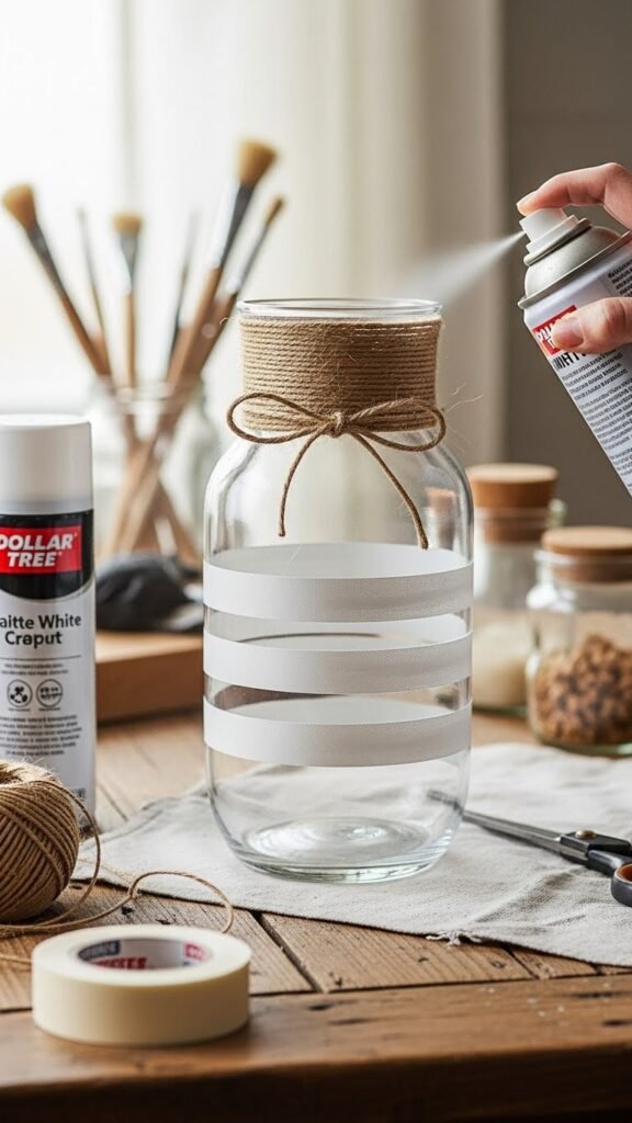 You’ll grab spray paint for a matte finish, mask areas for stripes, then wrap a twine embellishment near the neck for texture.