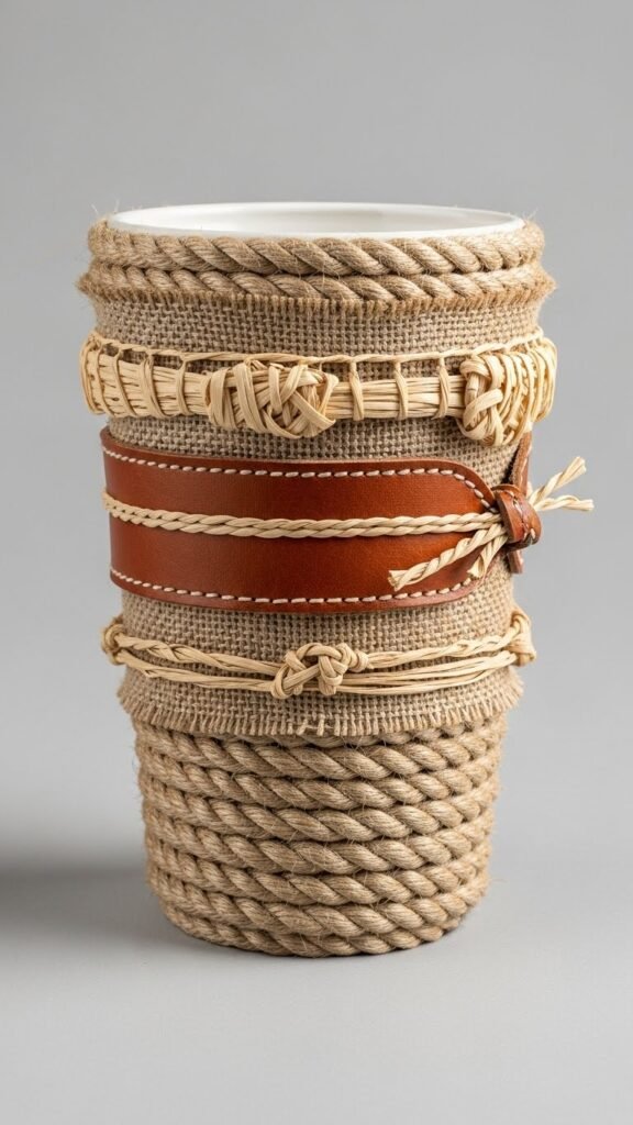 Give a plain vase new life by wrapping it in textured materials—rope, burlap, leather, or macramé—so you get instant character without buying anything fancy.