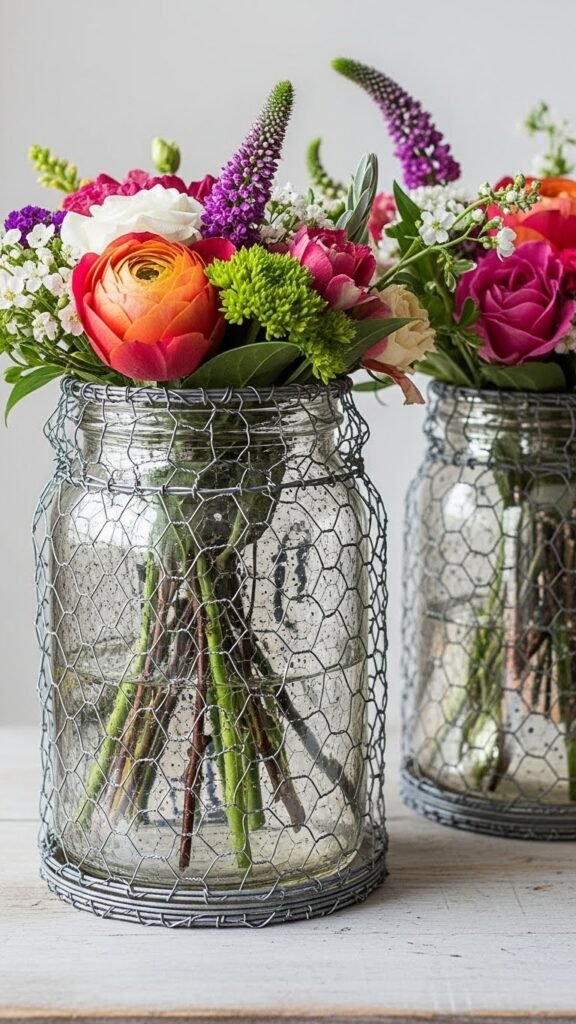 If you loved the vintage sheen of repurposed mercury glass, try pairing those jars with a chicken-wire secured arrangement for a more structured, modern-rustic look.