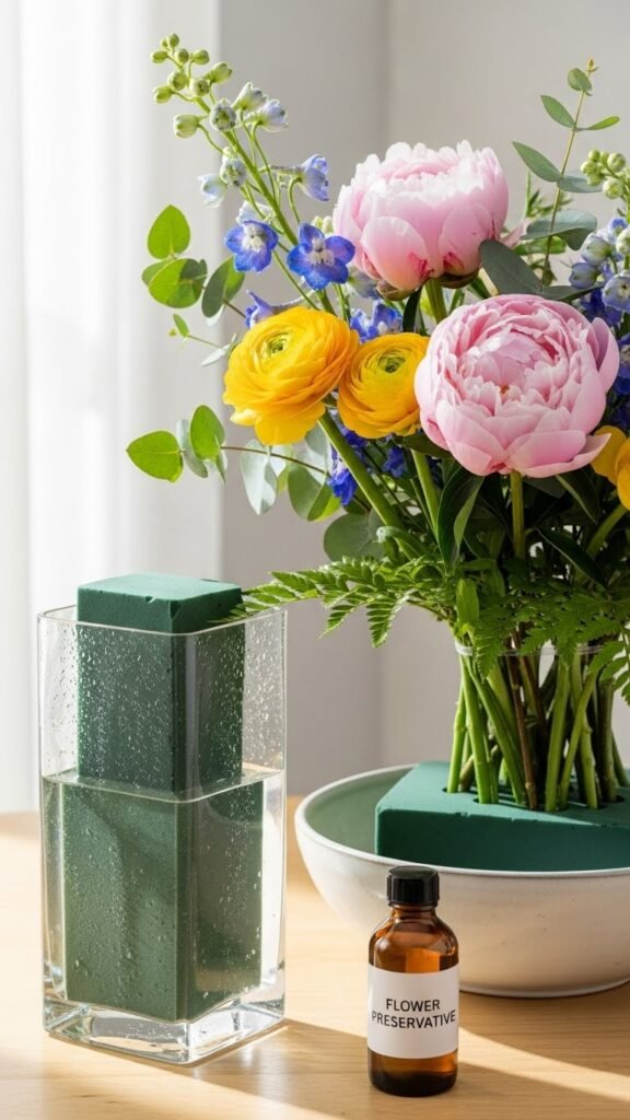 Soak a hydration block, press it into a shallow vessel, and you’ve got an instant, reliable base for arranging flowers with precision. You’ll master soaking techniques quickly, trimming stems to nestle securely.