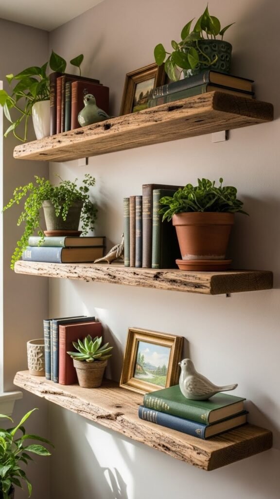 You’ll salvage planks with a weathered finish and striking live edge, cut to size, and mount hidden brackets for a floating effect. They free your space visually, add tactile warmth, and let you display books, plants, or art confidently.