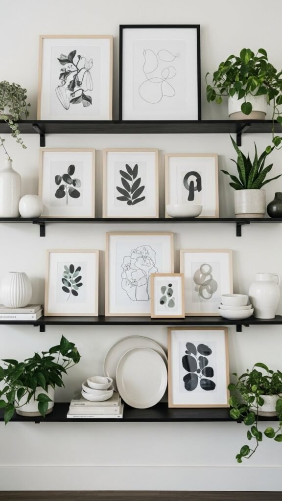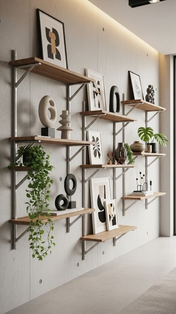 If you want to turn a bare wall into a rotating display, an open shelving wall gallery gives you a neat, flexible way to showcase art, plants, and collected objects while keeping the room airy.