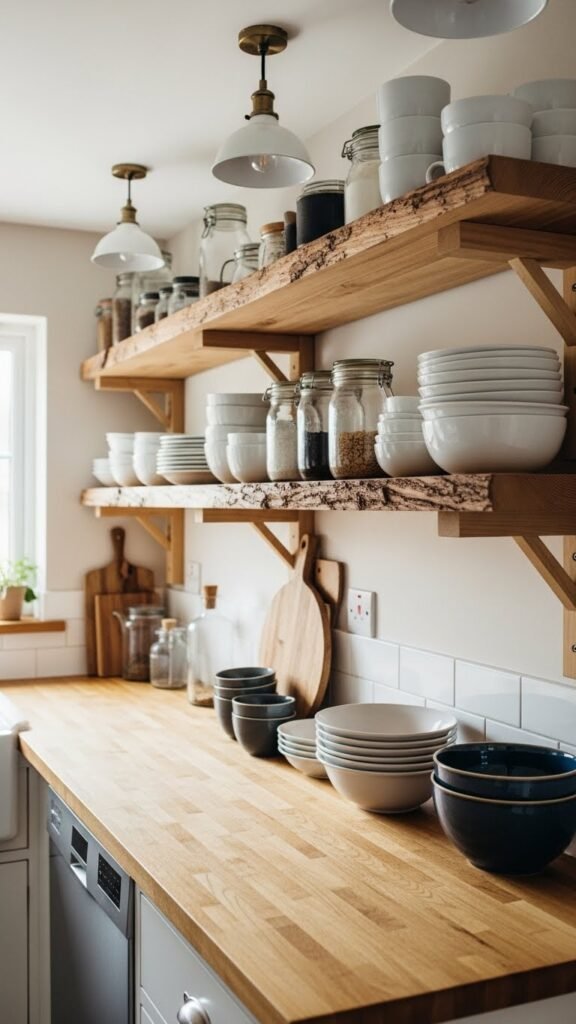 Choose chunky pine-edged shelves to bring warmth and sturdy charm into your kitchen; their thick, natural edges frame dishes and jars while resisting daily wear.