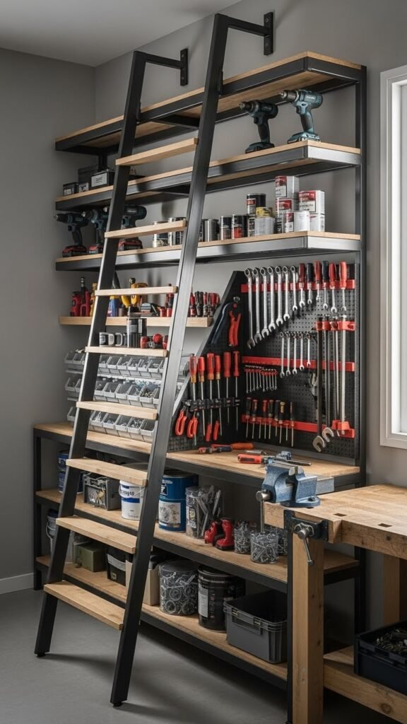 Although your workshop might be tight on floor space, a ladder-style shelving unit lets you stack tools and supplies vertically without sacrificing access or stability.