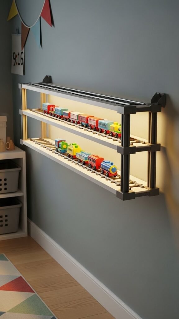 You’ll craft sturdy rails and a narrow ledge to showcase magnetic trains, keeping pieces organized yet visible.