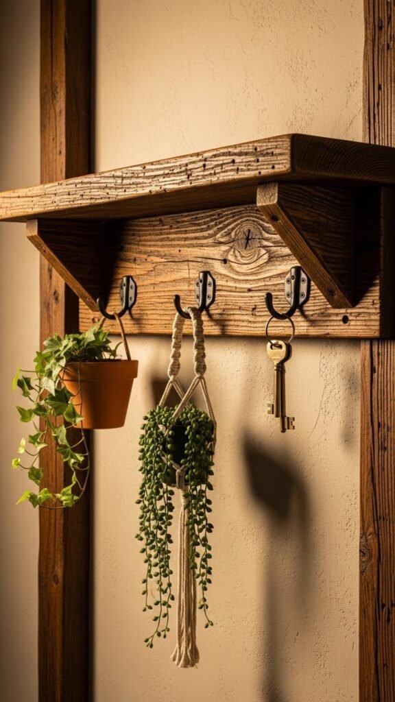 Add vintage hooks beneath for hanging plants or keys. The result feels lived-in, freeing, and utterly practical.