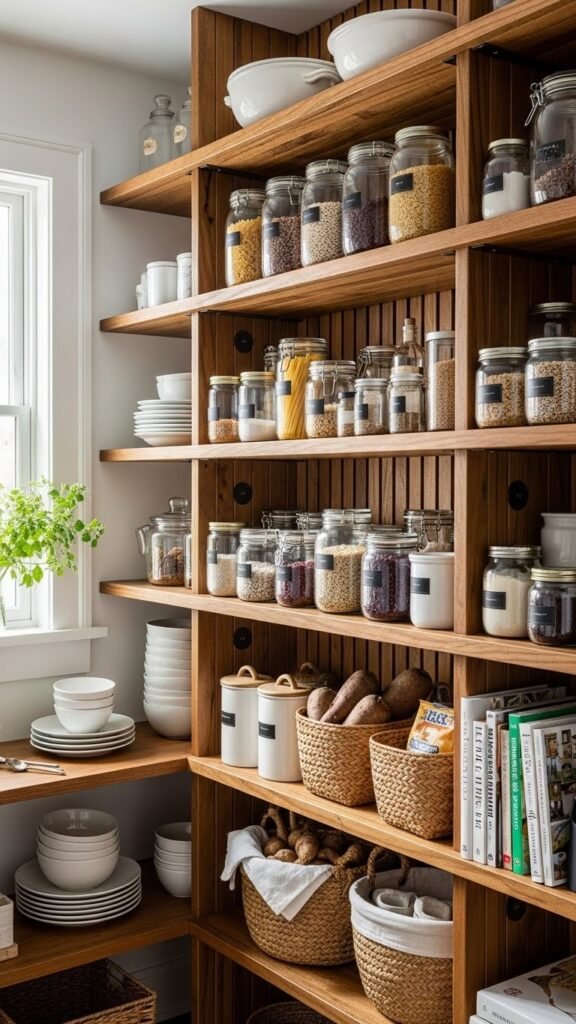 After you’ve enjoyed the character a reclaimed mantel brings to a room, apply the same hands-on spirit to your pantry by building adjustable shelves with simple supports. You’ll install vertical slats, slot in adjustable brackets, and set reclaimed boards at desired heights. This gives flexible, airy storage that lets you rearrange jars, baskets, and freedom-loving finds without tools beyond a drill and level.