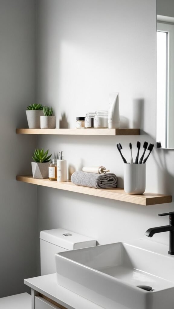 Choose floating boards or thin metal racks for minimalist vanity organization. They keep toothbrushes, creams, and a few decorative accents accessible while preserving roomy, liberated bathroom vibes.
