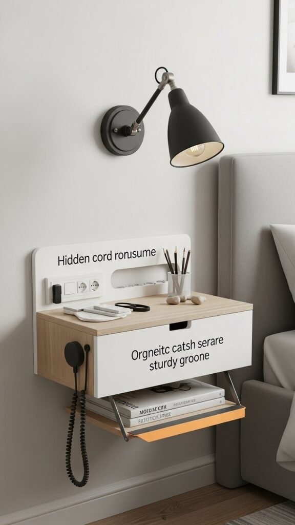 Create a sleek bedside spot with a floating nightstand shelf that tucks a hidden bracket into the wall for a clean, modern look. You’ll mount a compact shelf that holds a wall mounted lamp, hides cord routing through the stud, and offers a bedside organizer groove.