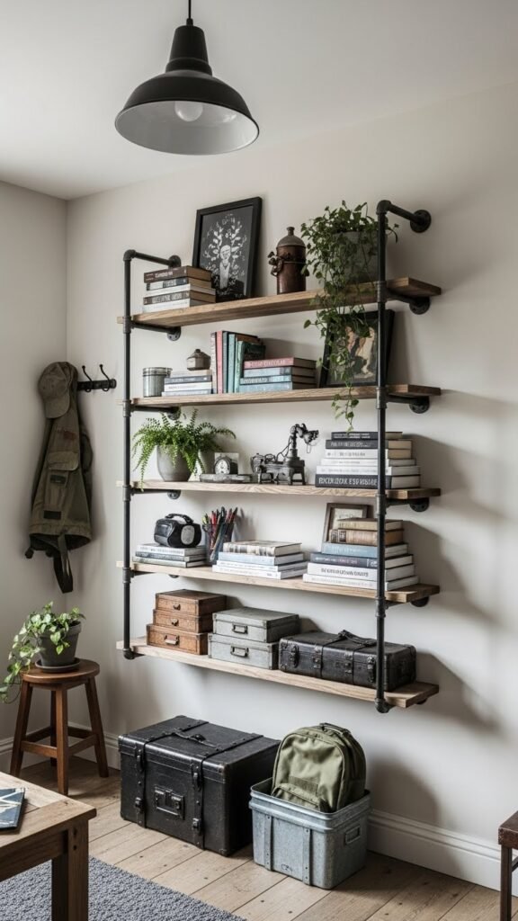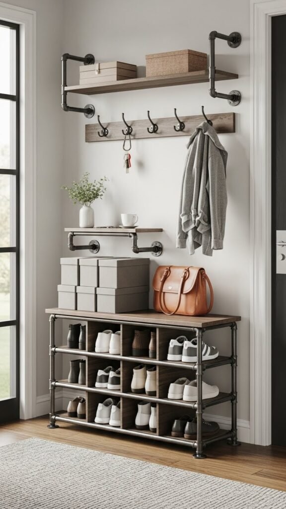 If you liked the raw, modular feel of pipe-bracket shelves, try that same industrial energy in a tiered entryway unit that organizes shoes, bags, and daily essentials without looking cluttered.