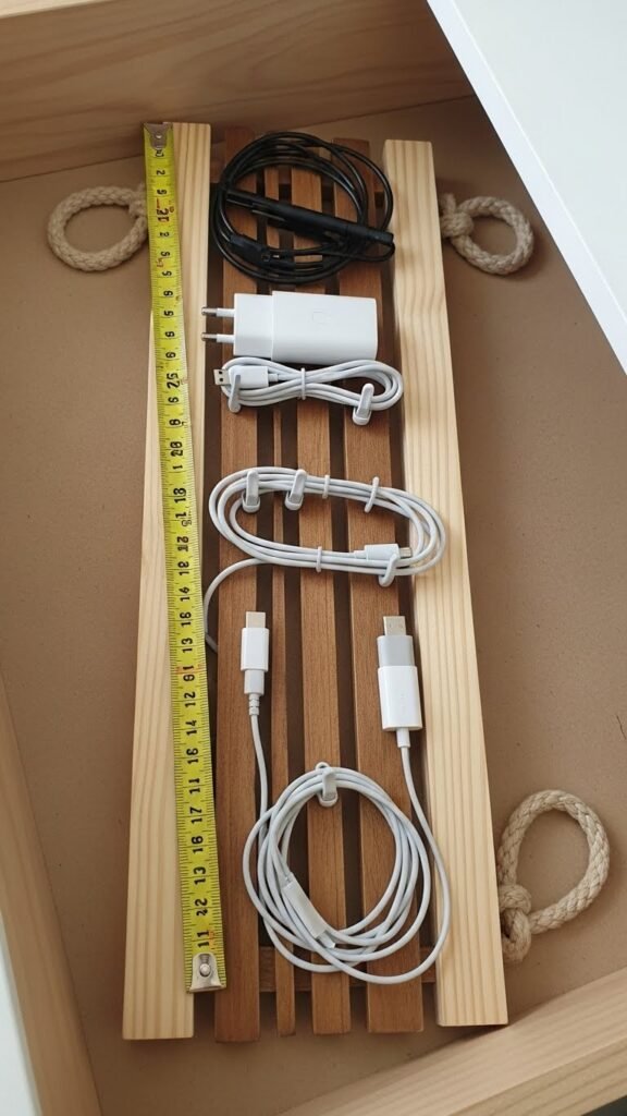 Create a slim, custom divider by fastening narrow wood slats across the drawer base and snapping cord clips onto the slats to hold chargers, cables, and headphones neatly in place.