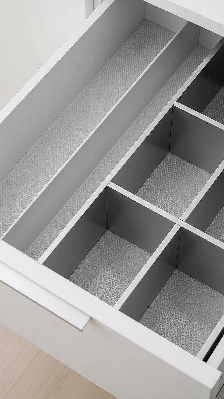 When drawers shift or small items slide every time you open them, stick adhesive non-slip strips along the base to keep things put and reduce noise. You’ll press adhesive grip strips into place, cutting to fit compartments and corners.