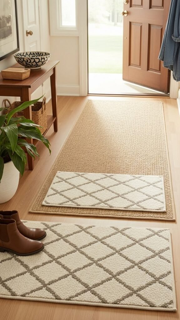 Choose a low pile runner underfoot, then a neutral hued accent rug with a subtle pattern. Prioritize weather resistant fibers for durability and a beveled edge for a finished look. You’ll create a welcoming, effortless entryway that’s practical and free.
