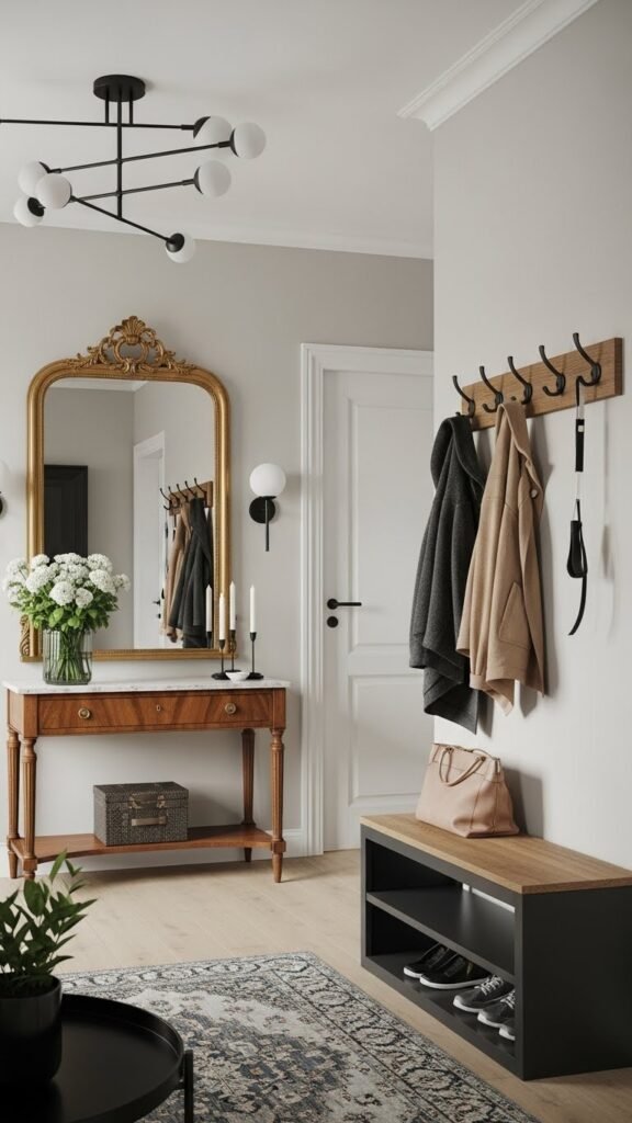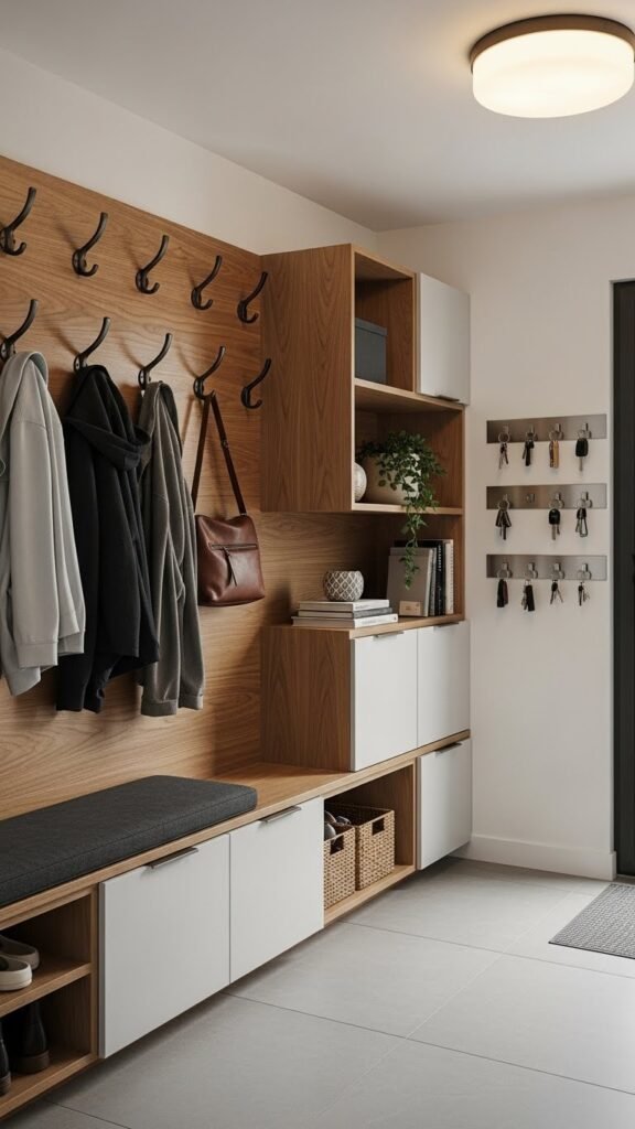 Create a mudroom makeover vibe with a slim bench, cubbies, and a wall-mounted shoe valet for quick organization.