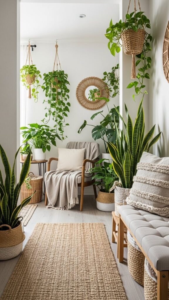 Living-room-meets-entryway greenery and natural textiles will instantly warm the space and soften hard surfaces; bring in a mix of leafy plants and tactile fibers to create depth and comfort. You’ll use living plantscaping—low-light pothos, sculptural snake plants—and organic textiles like a jute runner, linen throw, or cotton bench cushion to craft a liberated, lived-in entry that’s both chic and functional.