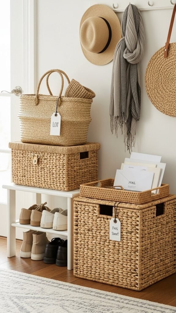 Bring order and texture to your entry by layering decorative baskets—stack a low, wide seagrass basket beneath a taller woven tote, or nest a small rattan tray inside a larger wicker bin to create zones for shoes, scarves, and mail.