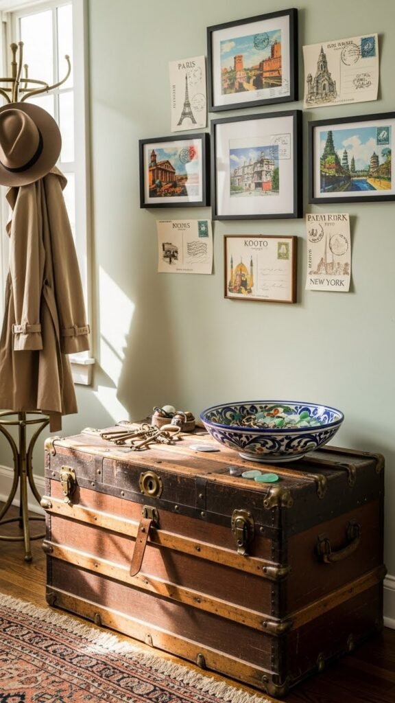 You’ll craft a crisp seasonal vignette: a slim tray, rotating found objects, a candle and seasonal sprig. Swap miniature wreaths on hooks, change textiles, and let the entry breathe free.