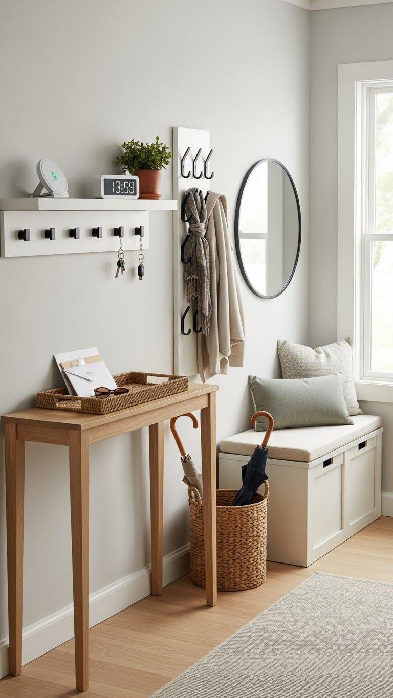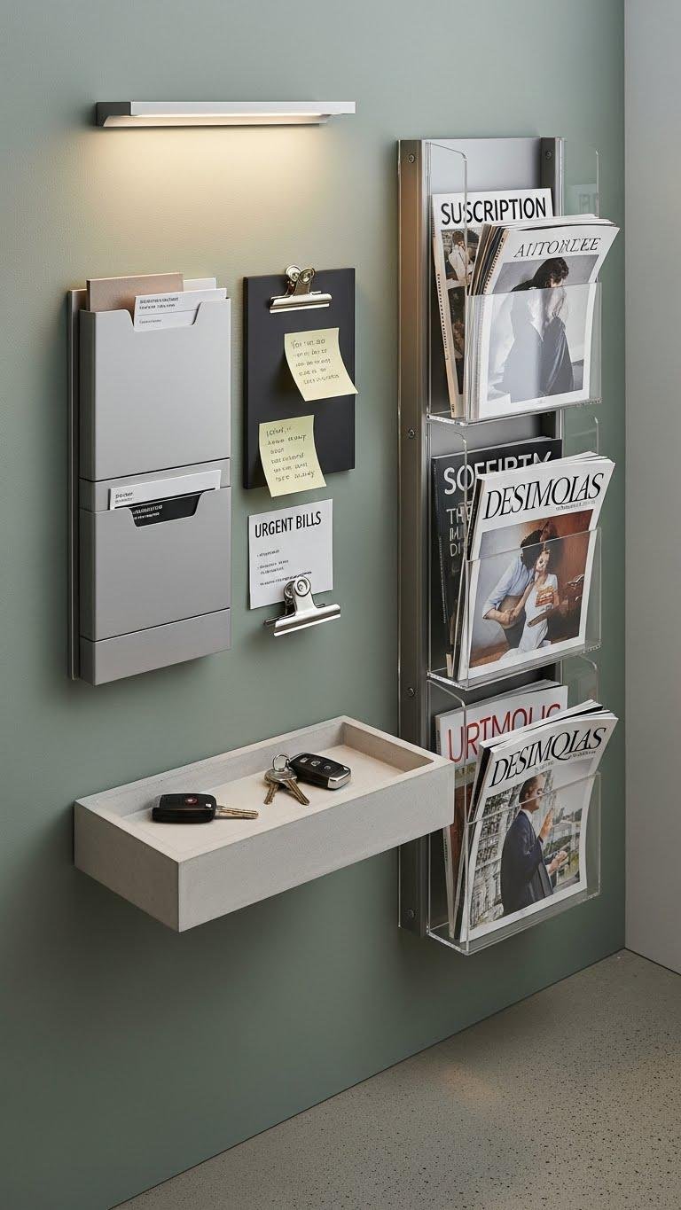 Design a compact mail and key station near your door so nothing gets lost in the shuffle: mount a slim wall organizer for incoming mail, add a shallow tray or hook strip for keys, and include a small slot or clip for urgent bills and receipts.